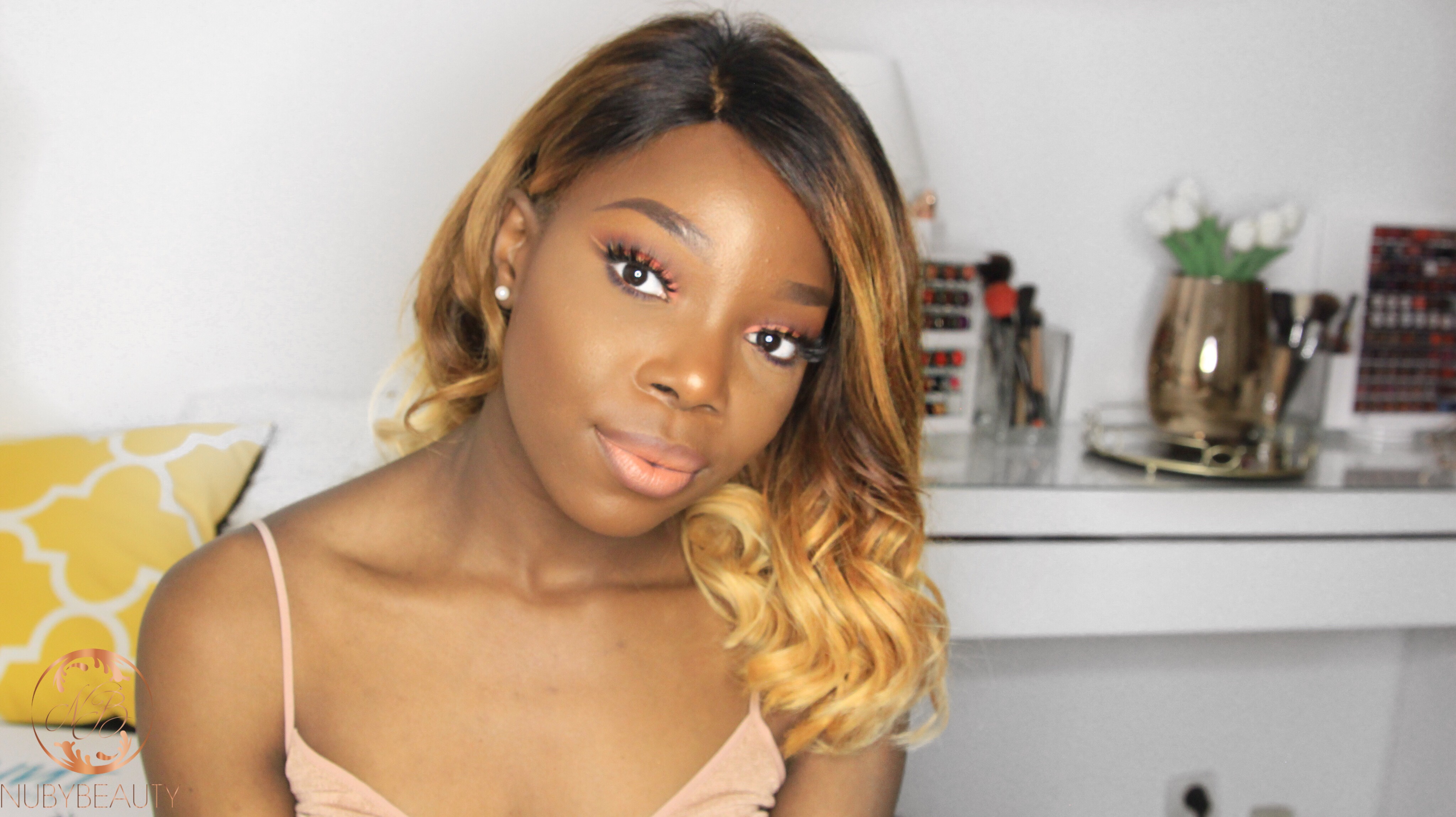 Du coup j’ai réalisé le look que j’ai imaginé, un cut-crease corail et un trait de eye-liner fait avec un anticerne. Ce trait de liner a une histoire ! C’est une grosse erreur que j’ai faite et qui était impossible à corriger, mais visuellement ça donnait un certain flow à mon maquillage alors j’ai décidé de reproduire la même chose sur l’autre paupière pour obtenir cet « double liner » kind off. Je trouve assez fun de jouer avec la couleur du trait de eyeliner ces derniers temps. j’ai quasiment mis mes traditionnels liner au placard et je m’amuse avec tous les autres produits pour obtenir des traits de eyeliners plus fun. Dans cette vidéo j’ai utilisé un anticerne, oui oui !! Je vous laisse regarder en vidéo le procédé.