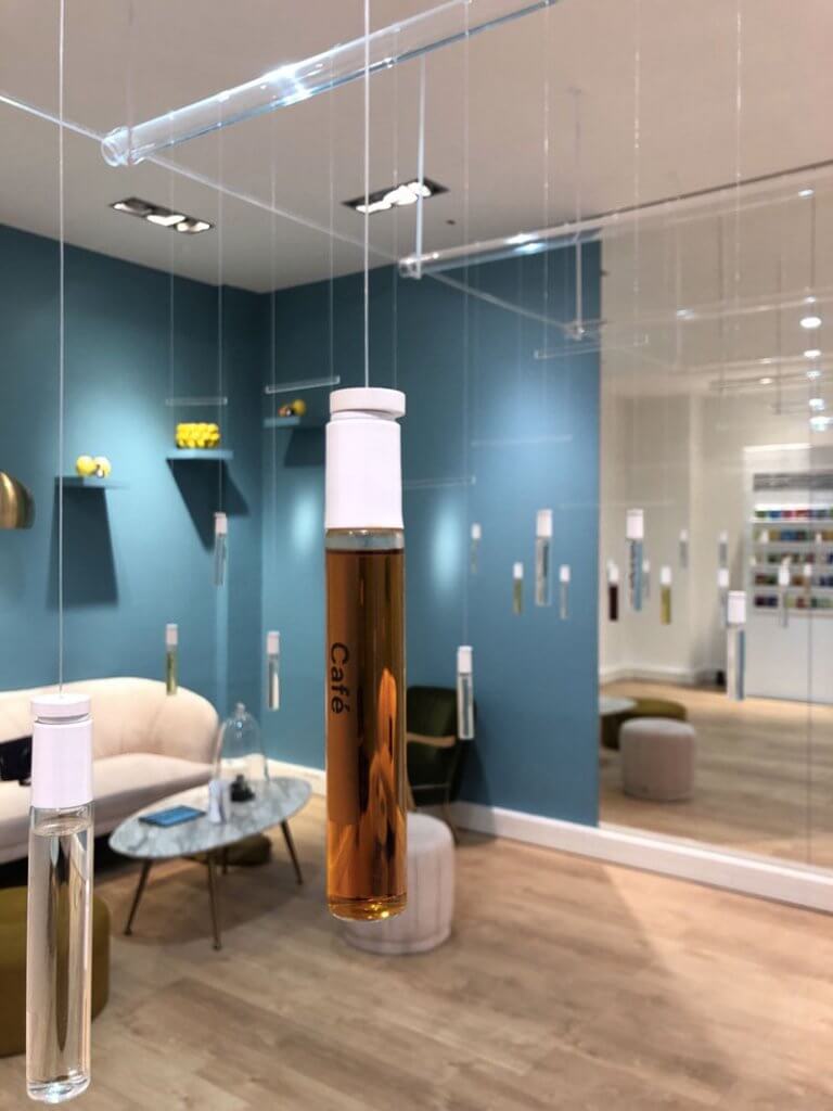 La décoration donne envie, colorée , originale et simple en même temps. Une invitation à se plonger dans l’univers du parfum.